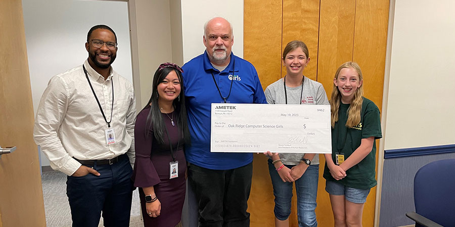 (L to R) Sempangi, Director of Human Resources for AMETEK AMT; Jenny, HR & Payroll Specialist for AMETEK AMT; the founder and members of Oak Ridge Computer Science Girls About Sensors and Fluid Management Systems